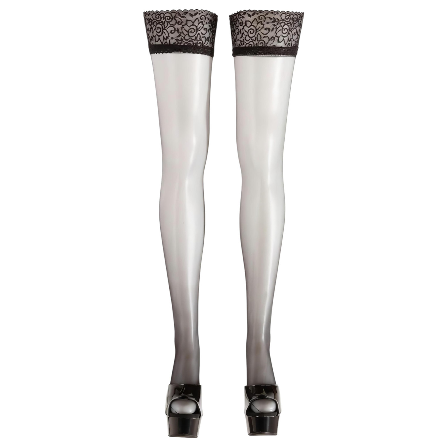 Prozirne, čarape do butina za žene sa širokim čipkastim rubom.
