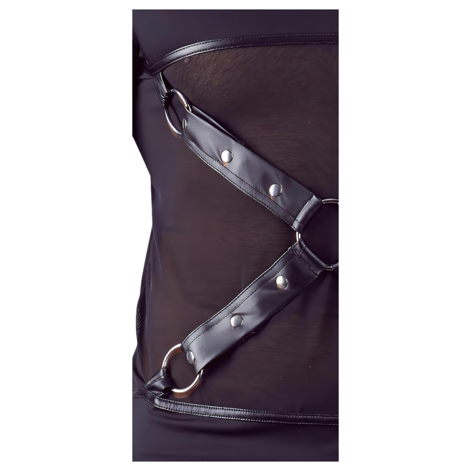 Seksi, svileni muški top sa ukrštenim trakama i prozirnim mrežastim detaljima.
